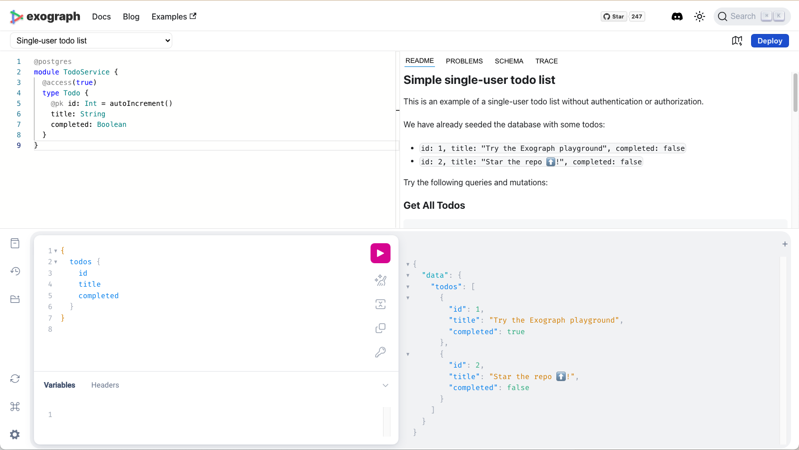This is just the beginning to make Exograph easier to explore. Here are a few planned features to make the playground even better (your feedback is welcome!):