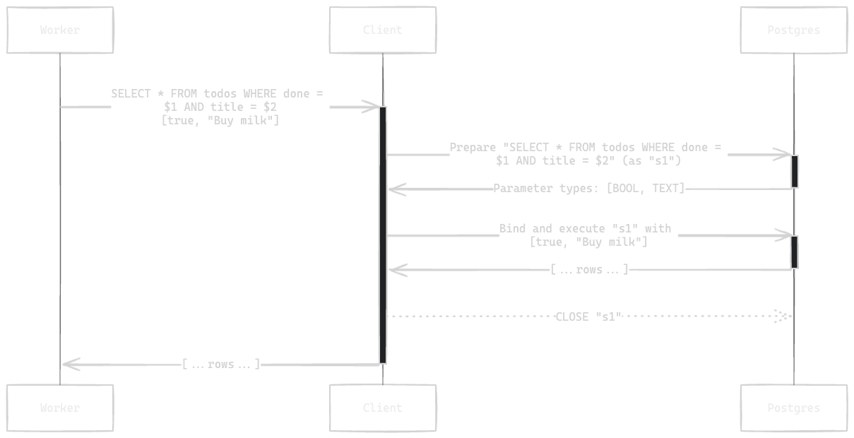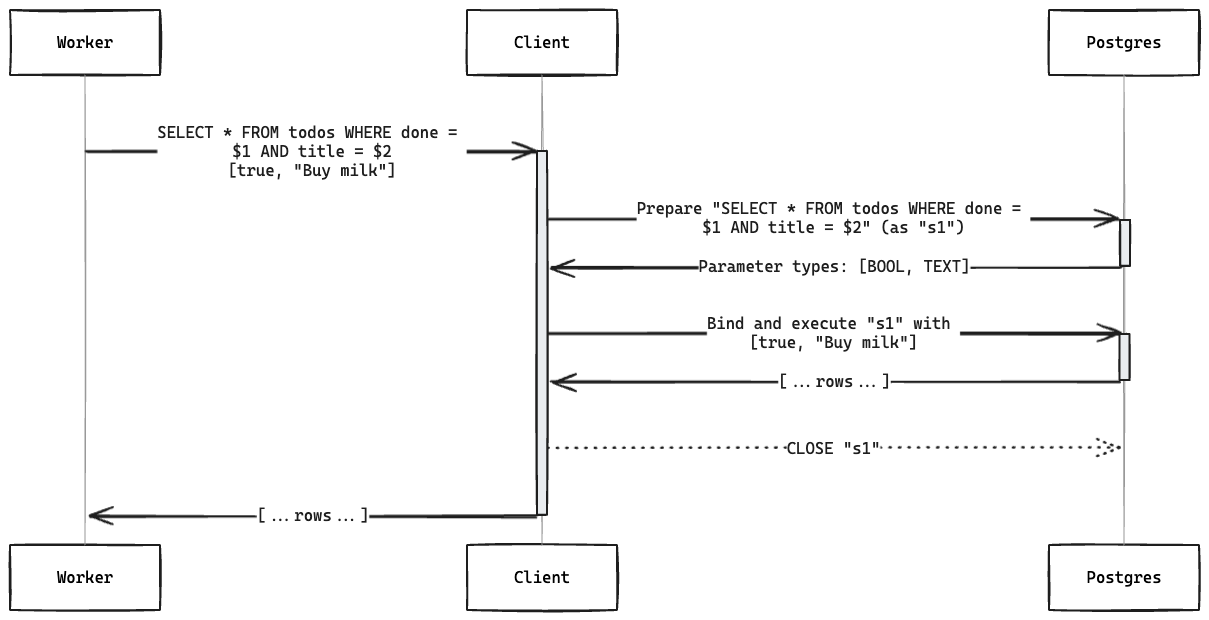 SELECT * FROM todos WHERE id = $1), and its execution requires a preparation step. We will go into detail in the next section.